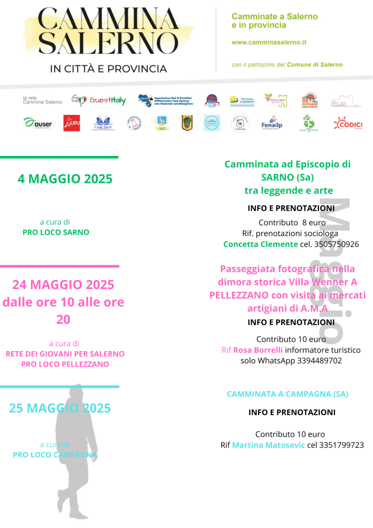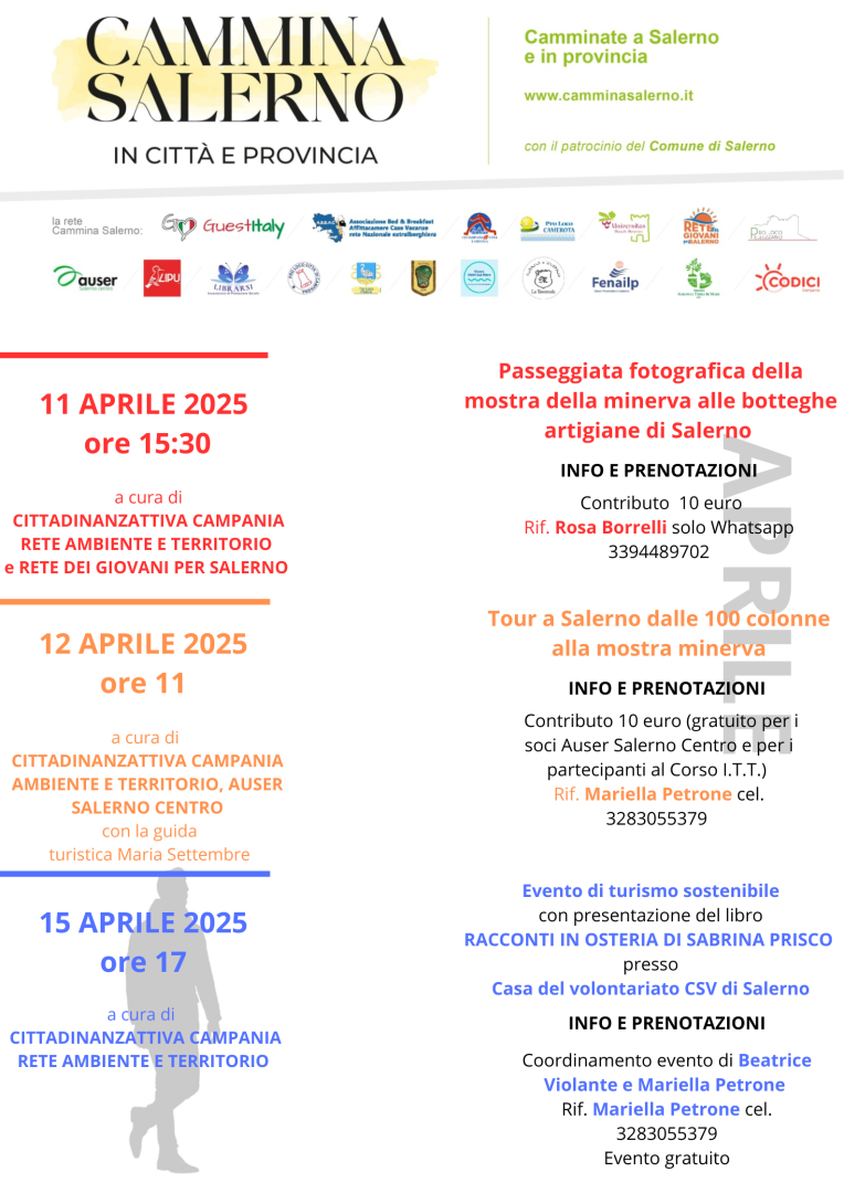 Cammina Salerno è un'iniziativa lanciata da una rete di associazioni, tra cui Abbac, Guestitaly, Fenailp, I Colori del Mediterraneo, Rareca e Rete Scale di Salerno, con la collaborazione di Cittadinanzattiva Campania, e Rete dei Giovani Salerno, Auser Salerno Centro, MM #SistemaBellezza Management , Lipu Salerno, Pro Loco Sarno, Pro Loco Padula, Pro Loco Campagna.